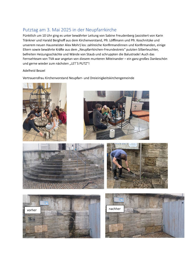 Es war überwältigend! Punkt 10 Uhr standen sie vor der Kirche: Unsere Konfirmandinnen und Konfirmanden, gekommen, um beim Putztag mit anzupacken. Zweimal im Jahr rücken wir nämlich mit Besen, Schaufel, Putzzeug an und reinigen mit vereinten Kräften, was nicht im regulären Putzplan steht.